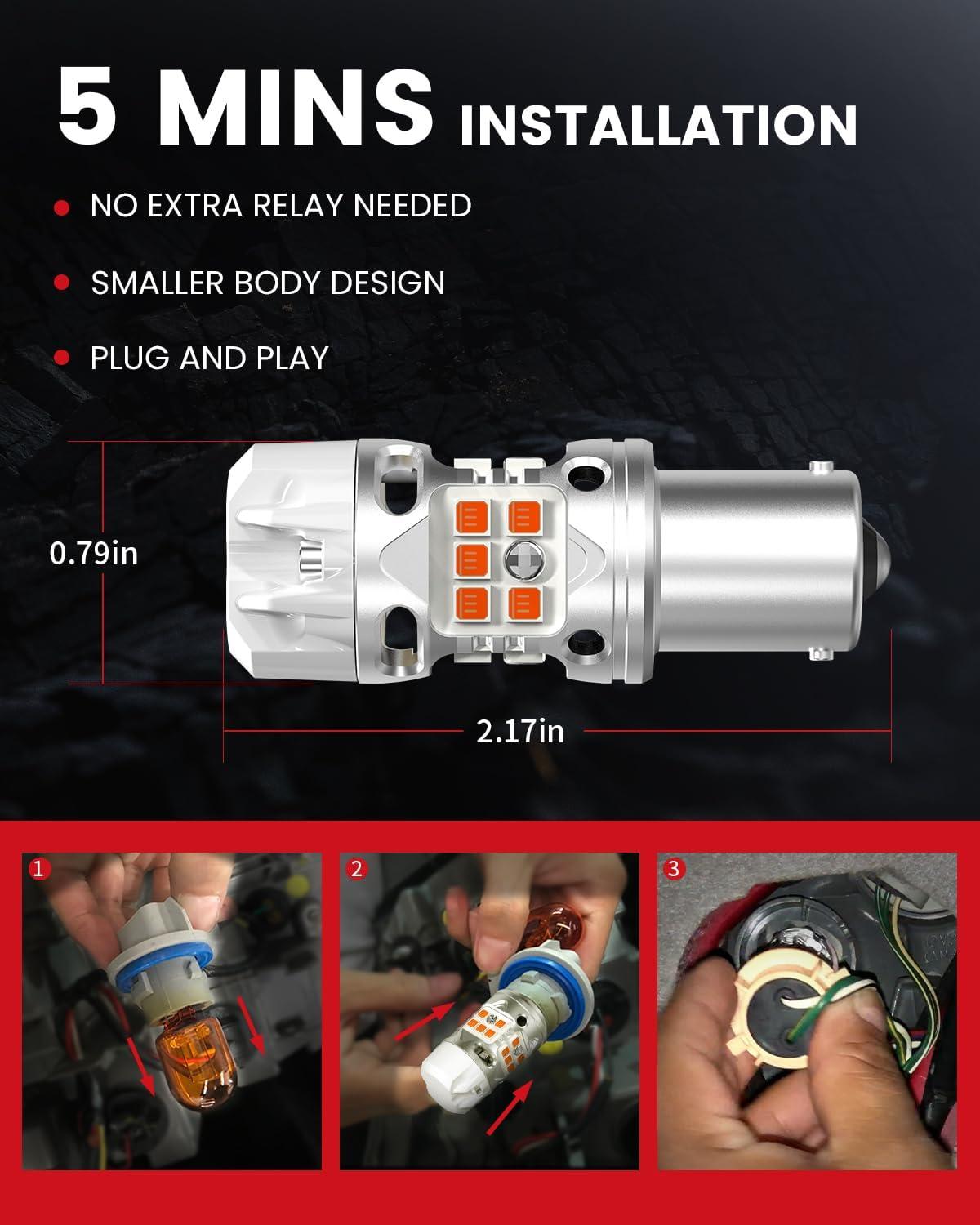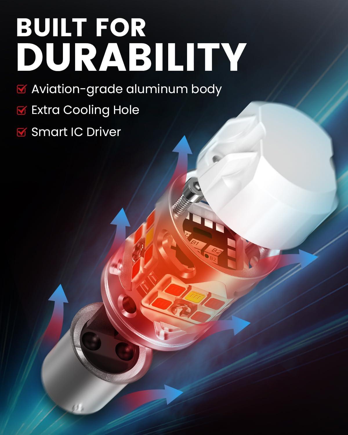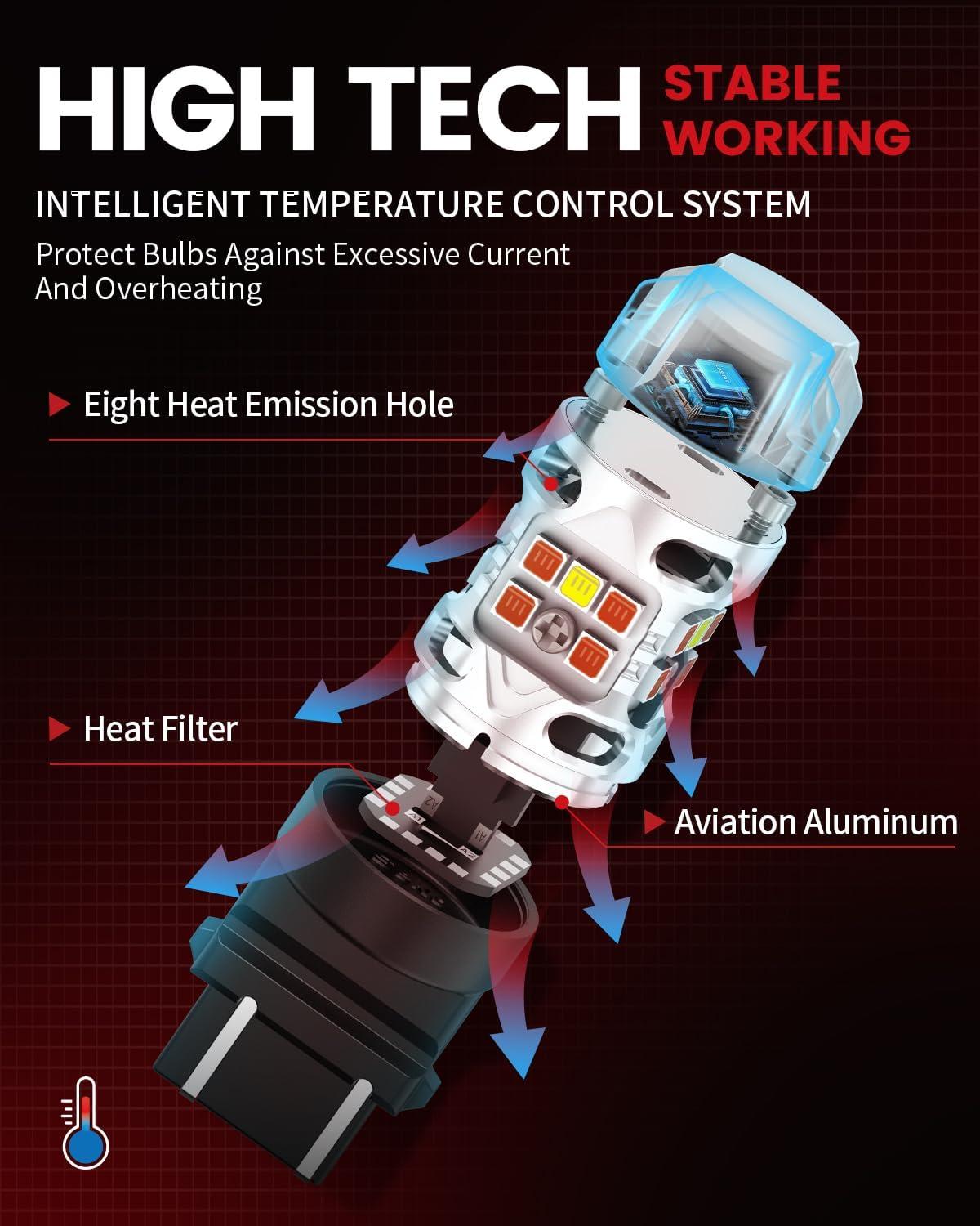 30,000Hrs Long Lifespan: The 3157 amber LED bulbs feature an Intelligent Temperature Control System (ITCS), ensuring optimal performance even on scorching days. They are designed with an aluminum casing that has a textured finish for enhanced heat dissipation. Additionally, internal heat filter fins provide further cooling, ensuring reliable performance.