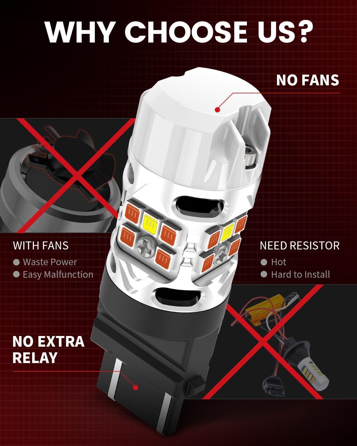 500% Brighter Than Halogen:The LASFIT T3 3156 3157 turn signal bulbs are an impressive 500% brighter than halogen bulbs. Equipped with 20 top-grade 3030 LED chips, they deliver a 360° full lighting effect. Each bulb provides 4000 lumens and 48 watts of amber lighting for turn signals. The brightness is accurately measured, ensuring a visually appealing driving experience with vibrant colors.