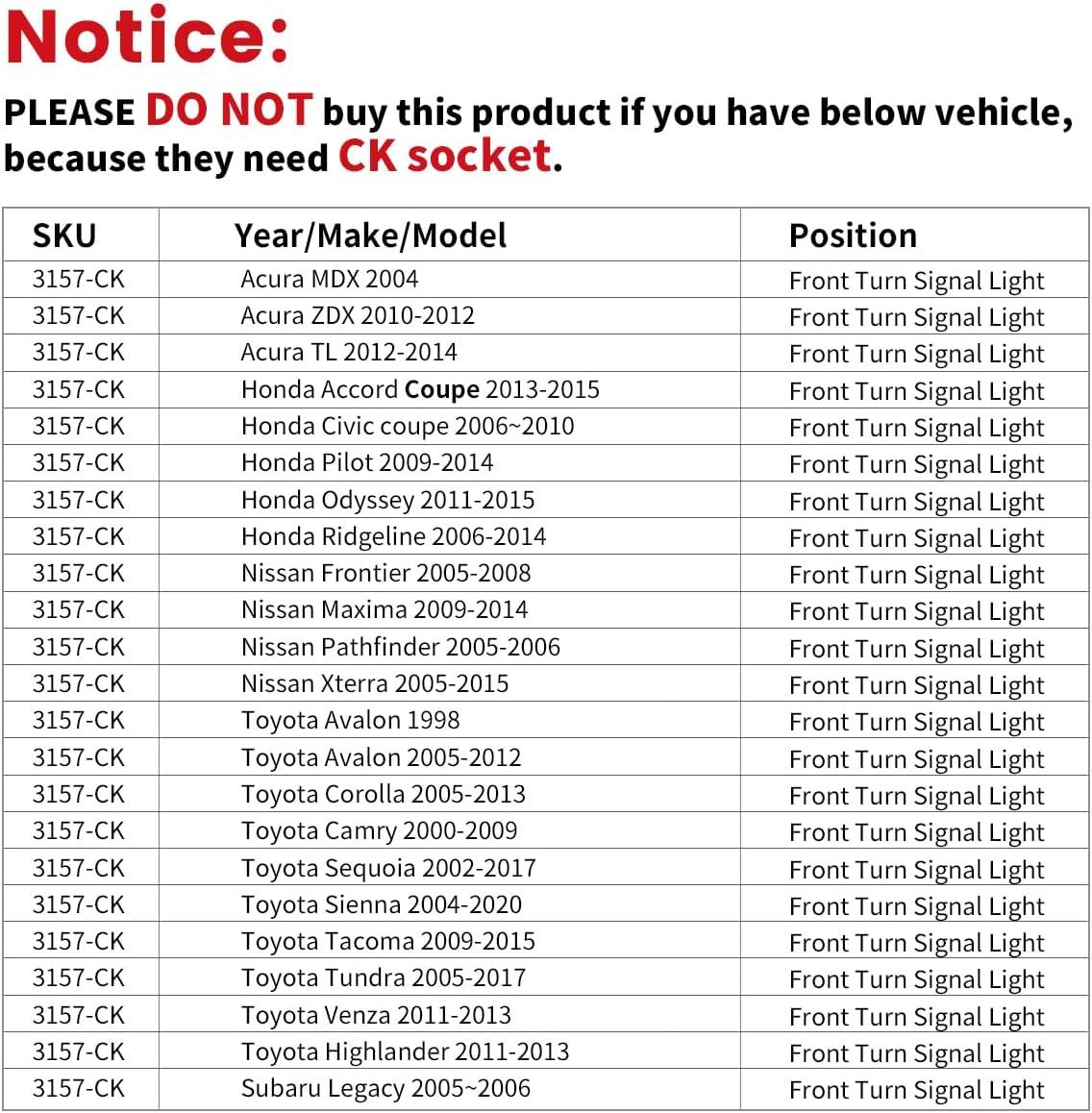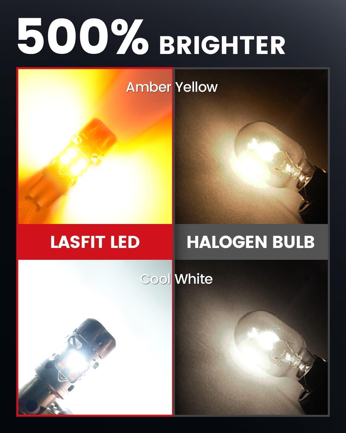 5-Min, Easy To Install: Replace your turn signal bulbs in just 5 minutes with no modifications needed and no extra decoder required. The LASFIT 3157 LED bulbs are designed to perfectly fit OEM halogen bulb sockets, ensuring a seamless fit in your housing. Compatible with standard sockets for front or rear turn signal lights, including models 3056, 3456, 4156, 3047, 3057, 3155, 3357, 3454, 3457, 4057, 4157, 3757, 3057A, and 3357NA.