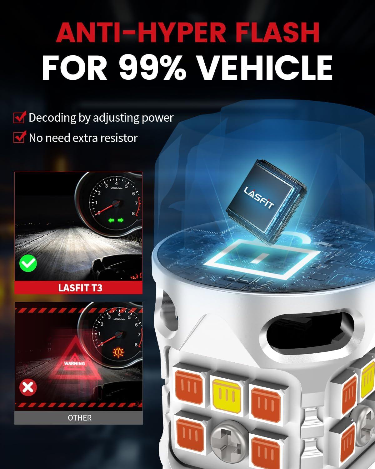 99% Canbus Error Free:The LASFIT 3156 3157 LED bulbs are designed to integrate flawlessly with 99% of vehicle computer systems, thanks to their upgraded built-in resistor. After extensive testing, LASFIT has eliminated the need for additional resistors, providing a truly advanced turn signal solution. Say goodbye to hyper flashing and enjoy a worry-free driving experience.