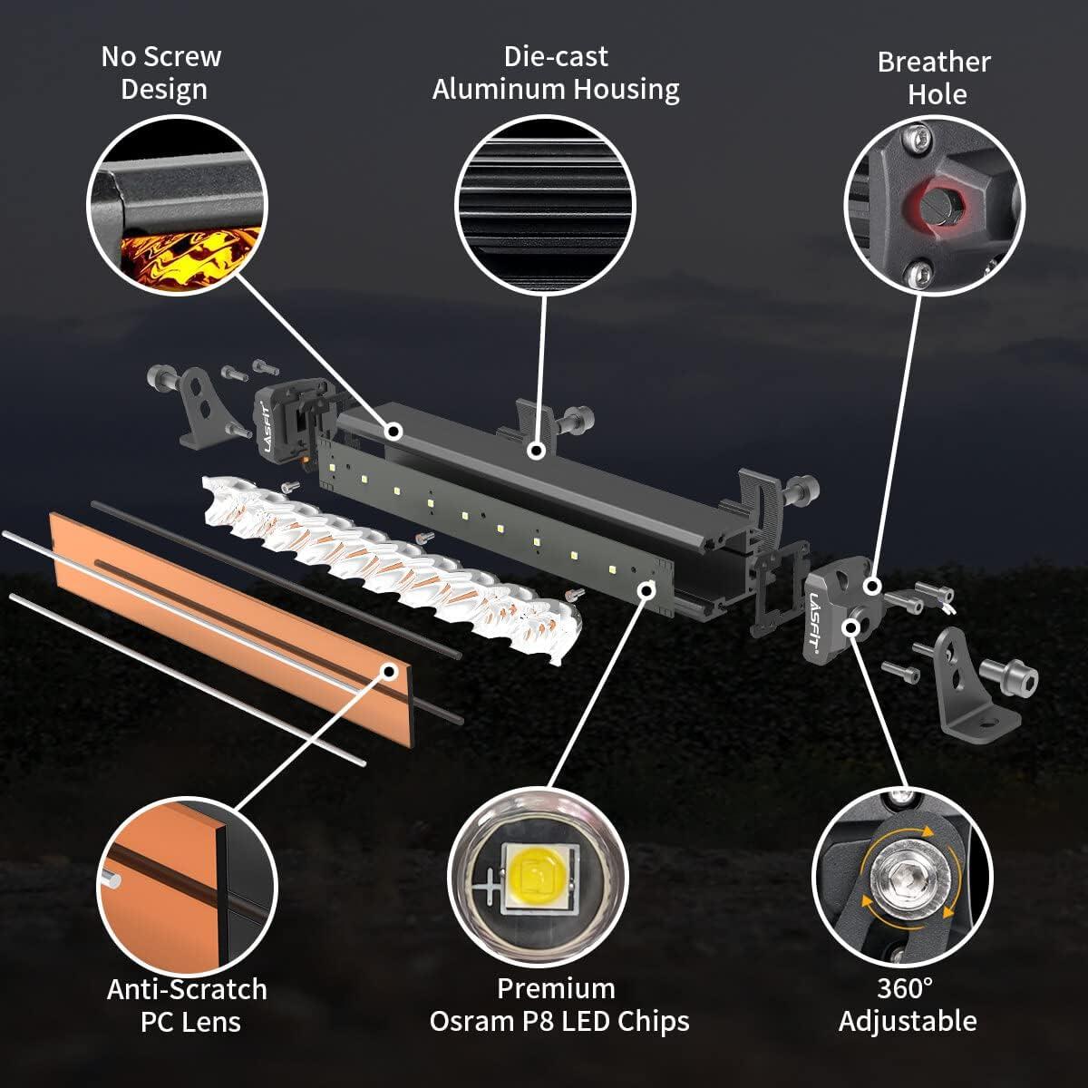 HIGH BRIGHTNESS FOR CLEAR VISIBILITY: Lasfit Led Light bar features with 40pcs 3W OSCONIQ P 3737 LED Chips, the luminous efficiency is 99.85LM/W, which has high luminous efficiency and long life. The combination of the spot and flood beam which provides widespread and long distance illumination to ensure your driving safety. You get what you pay for.