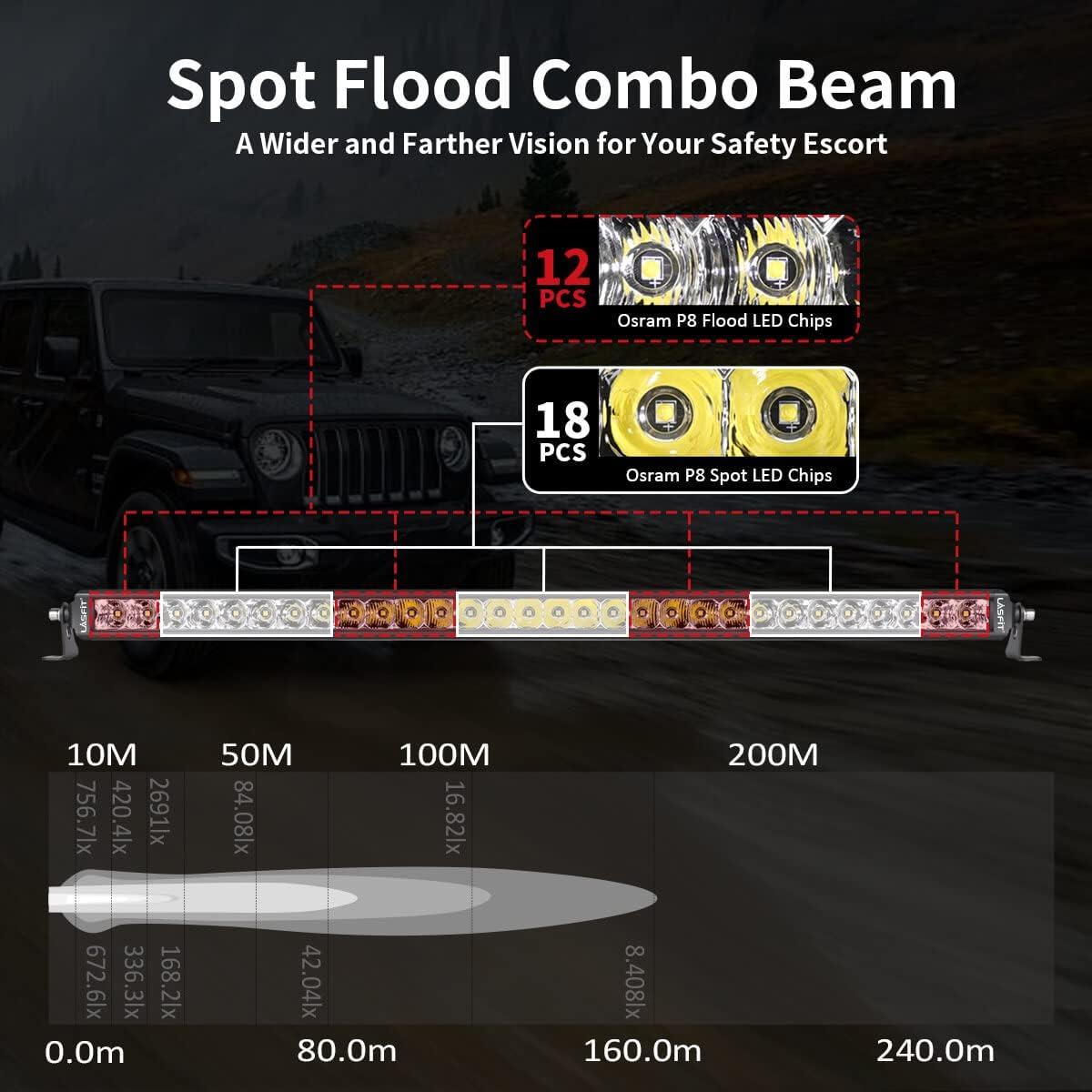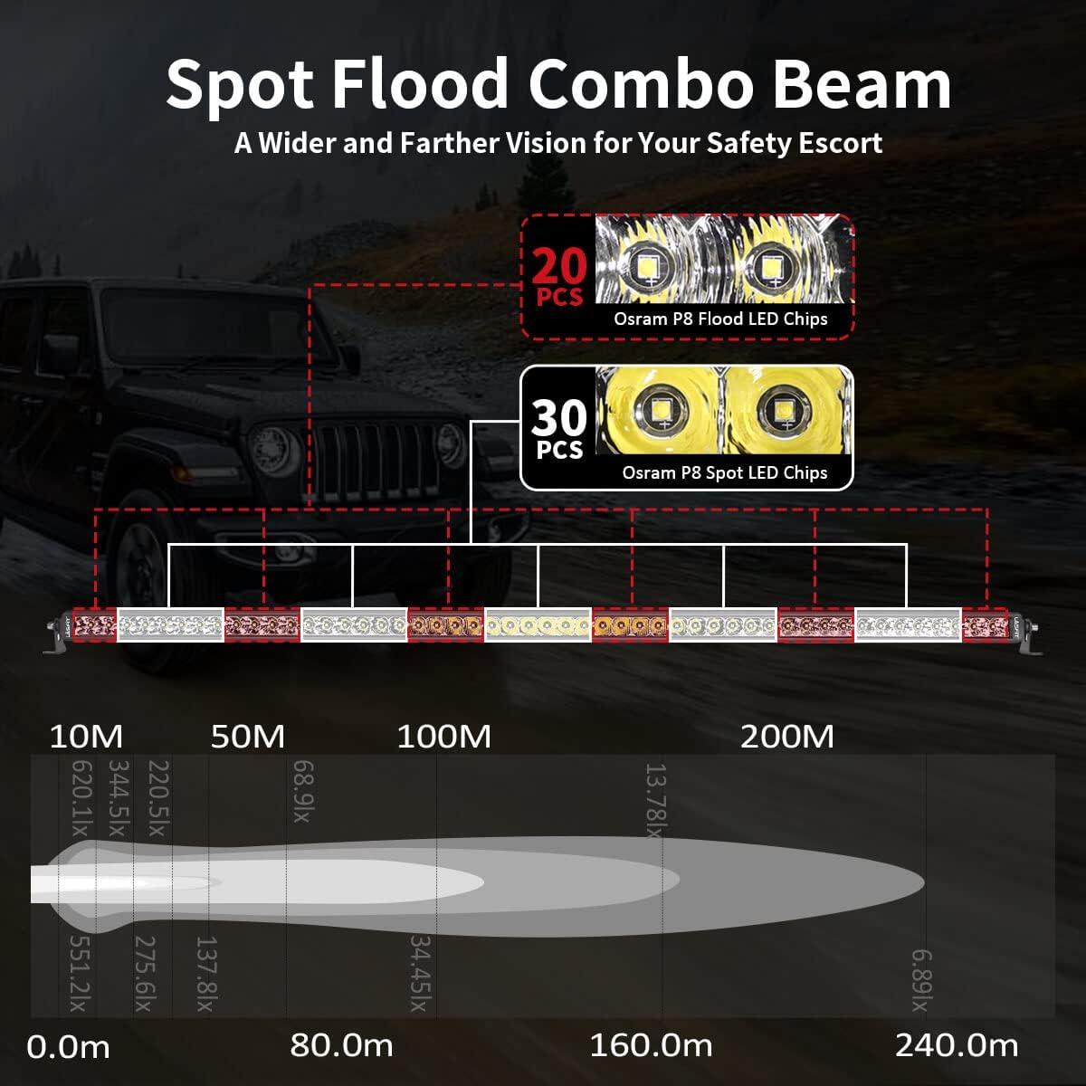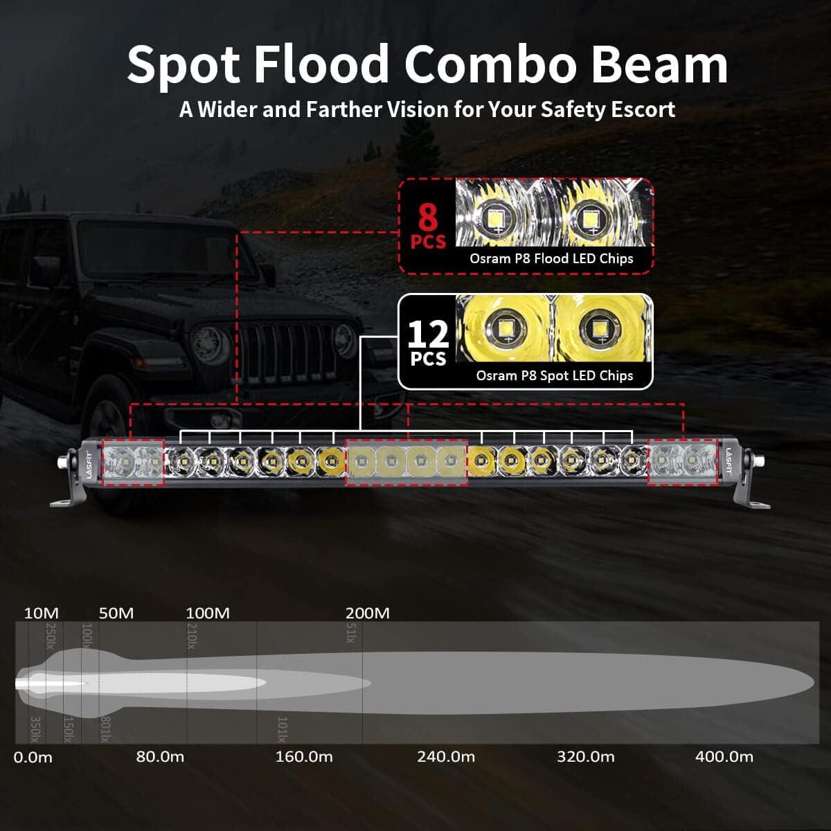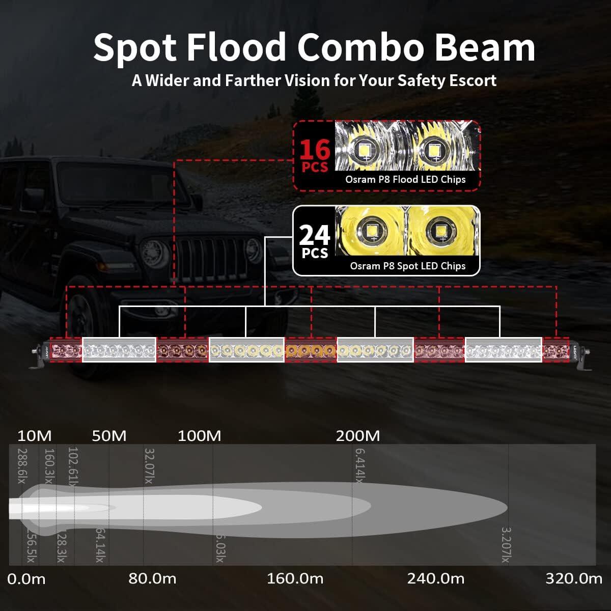 HIGH BRIGHTNESS FOR CLEAR VISIBILITY: Lasfit Led Light bar features with 40pcs 3W OSCONIQ P 3737 LED Chips, the luminous efficiency is 99.85LM/W, which has high luminous efficiency and long life. The combination of the spot and flood beam which provides widespread and long distance illumination to ensure your driving safety. You get what you pay for.