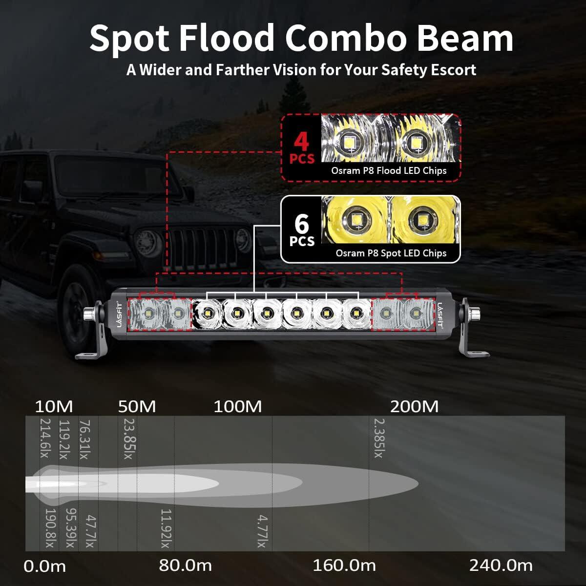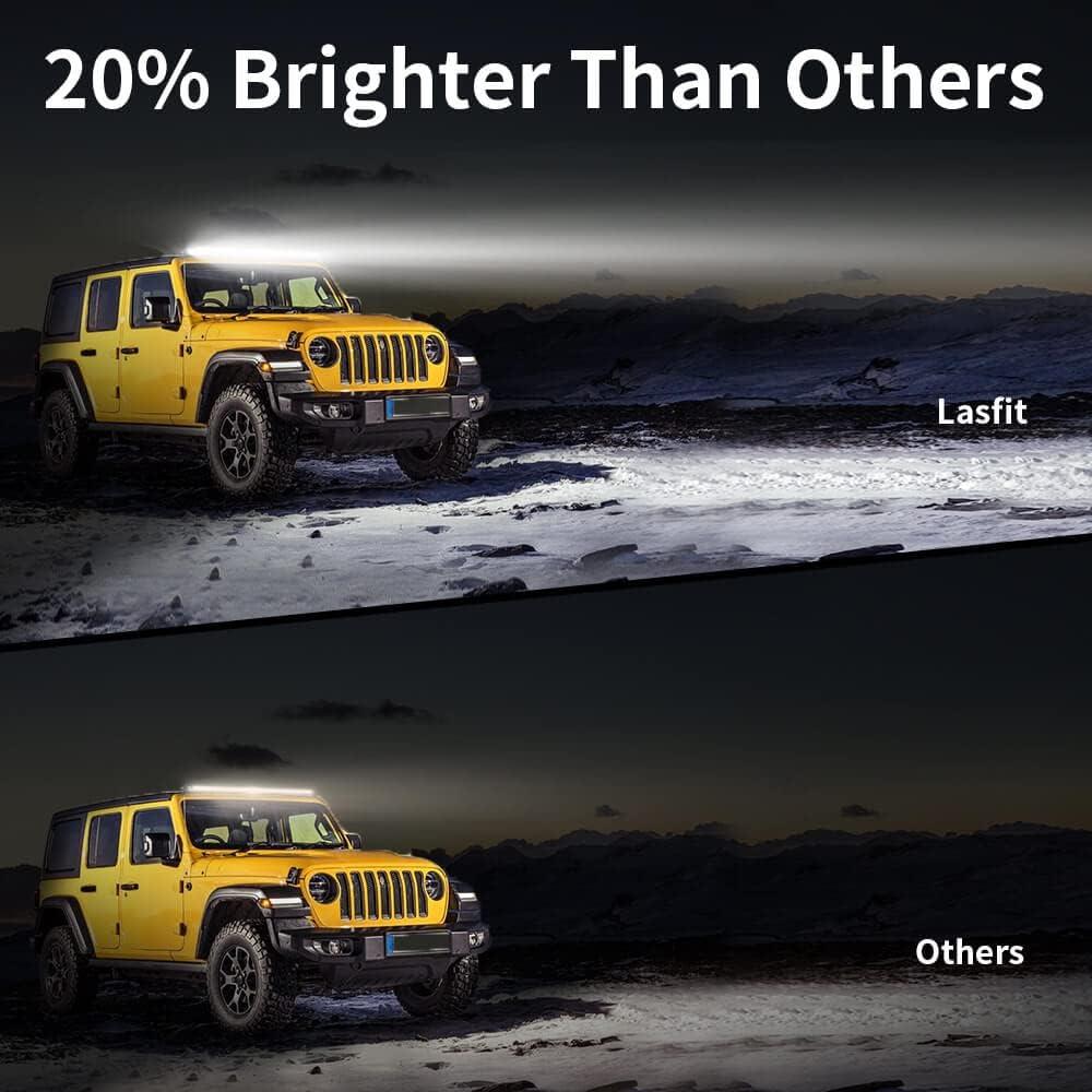 GREAT LIGHT EFFECT: The Light effect related to the usage of the power. The usage of the power of Lasfit light bar is 50%-70%. Lasfit light bar has about 100LM/W. It means that 1W can output 100 Lumen ( Others generally has 80LM/W). In the case of the same wattage, the higher the output lumen value, the brighter the light.