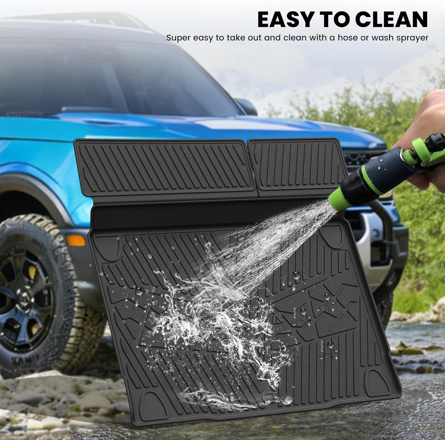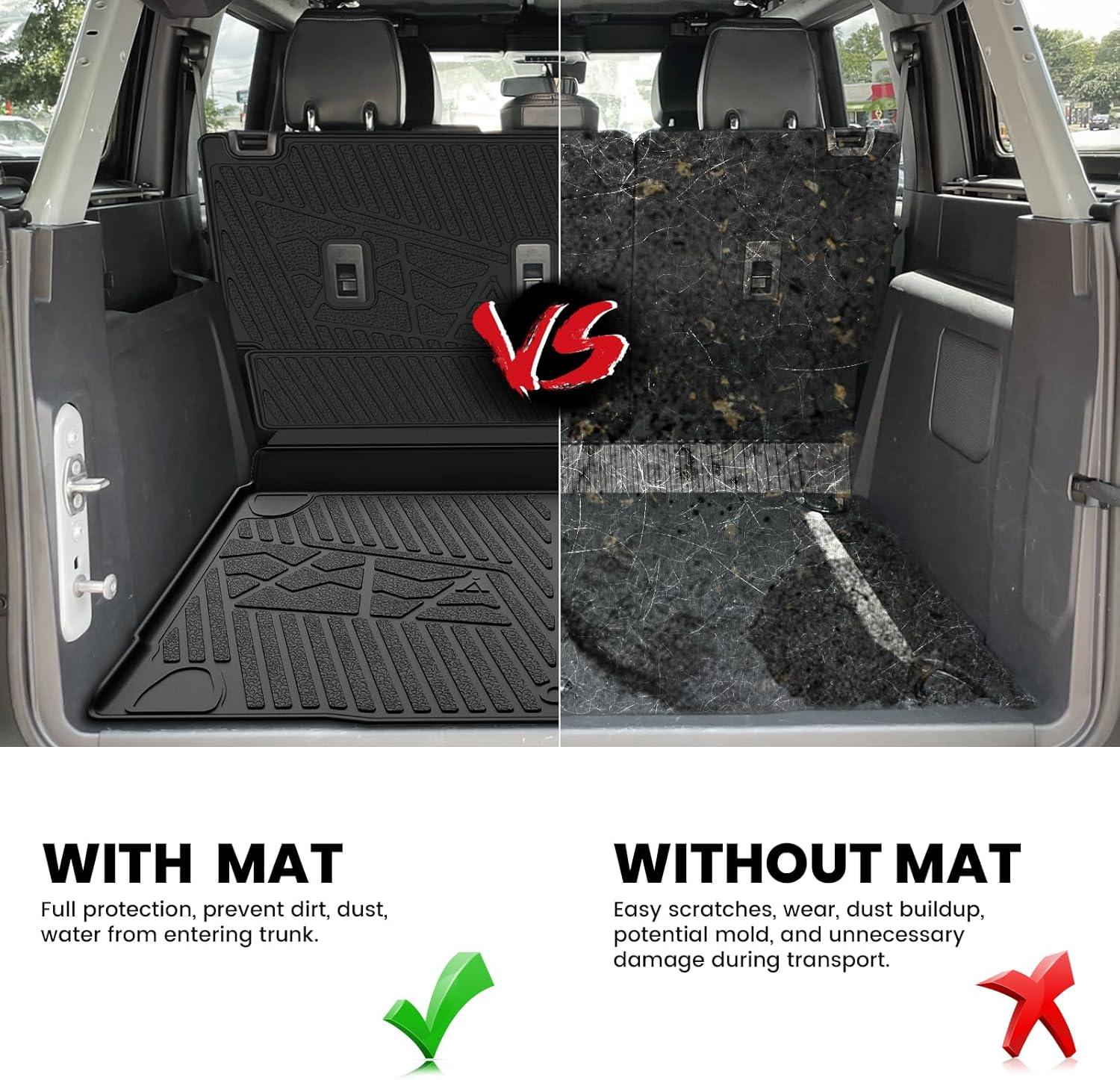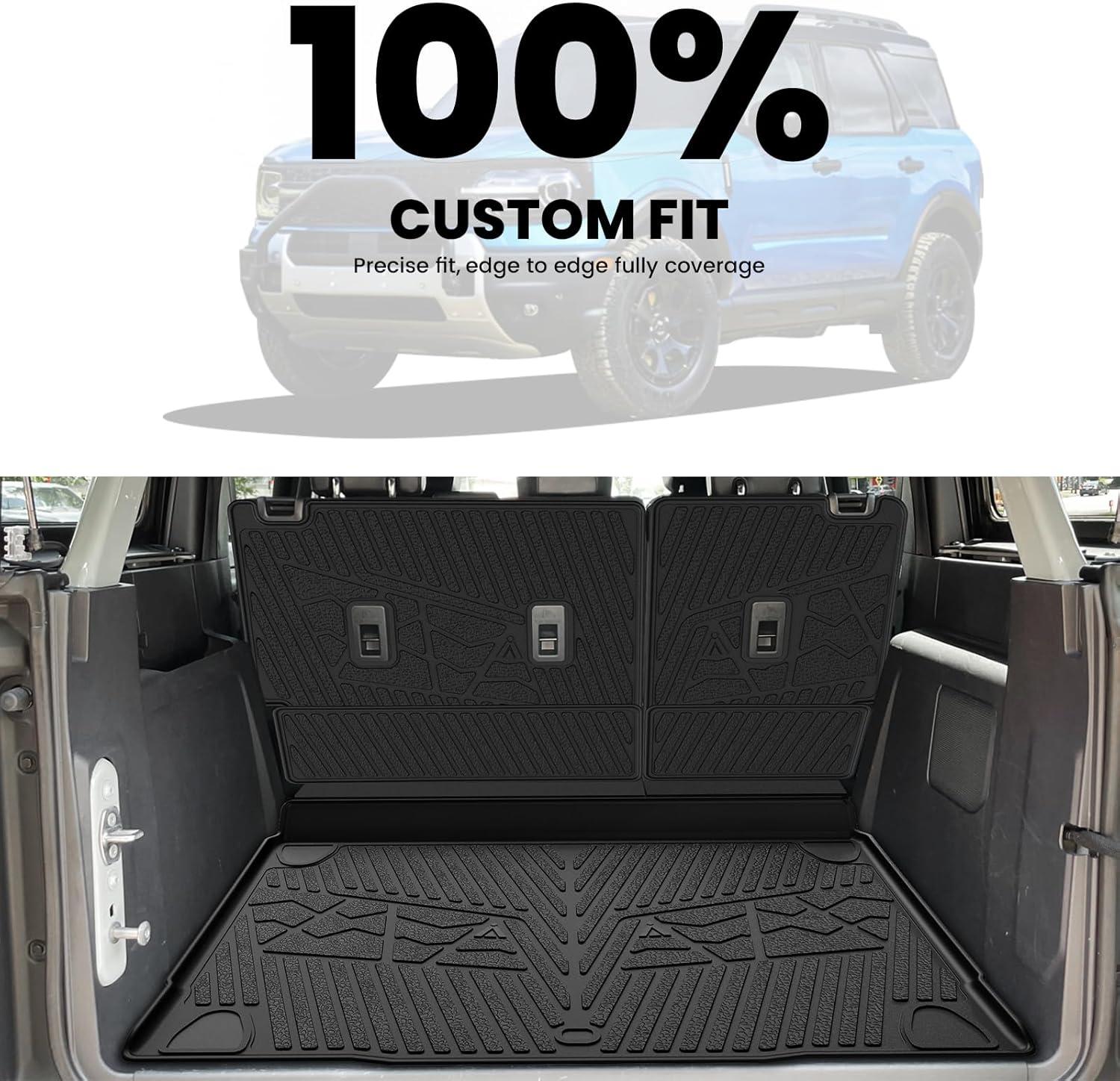 Complete & Custom – Fit Protection for Your Bronco SUV, This 4-piece set includes trunk area liners and backseat mats, designed exclusively for the 2021-2025 Ford Bronco 4-Door. Using 3D digital laser scanning, each piece contours perfectly to your vehicle’s cargo area and seat backs, offering seamless, factory-like coverage that protects every inch from spills, scratches, and wear