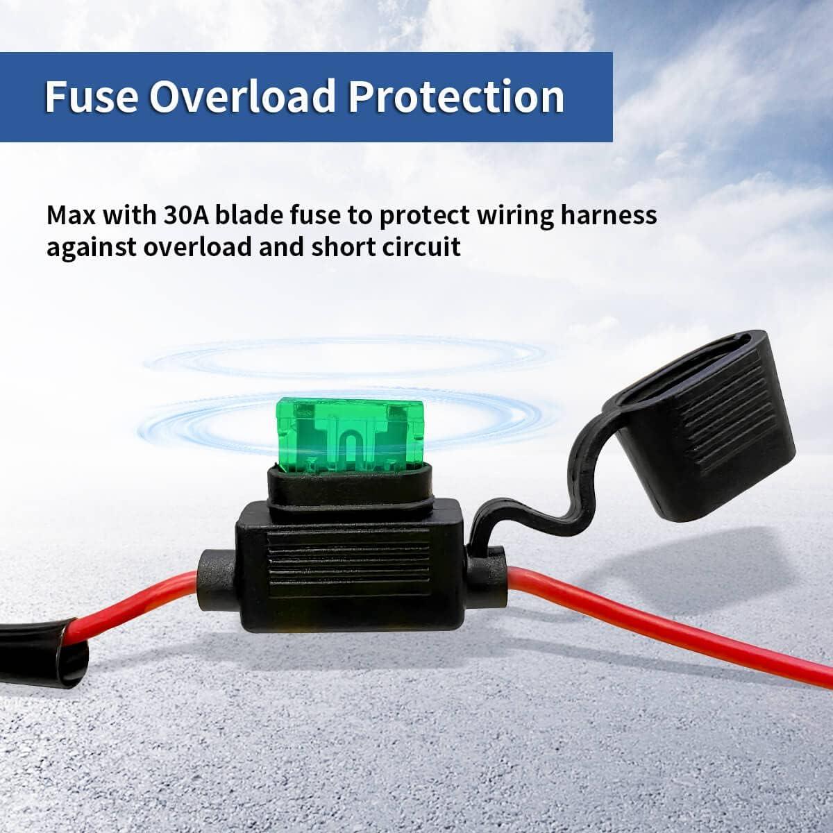 【Multiple Safety Protection】 – Input 16 AWG, output 18 AWG Wite Gauge ,inline blade fuse to defense against overcurrent and short circuit,High-quality PVC material make sure waterproof.Wiring Harness comes with 120W Max Wattages suitable for most vehicle